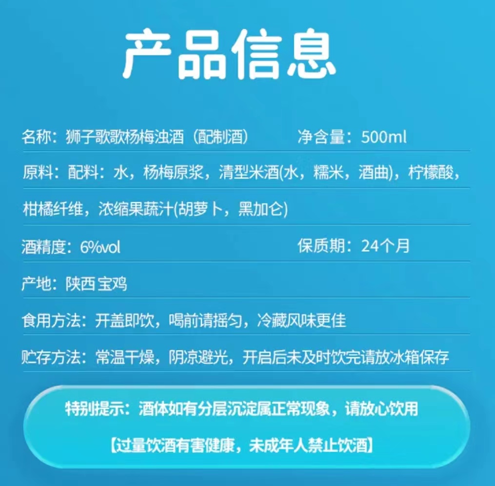 根據(jù)獅子歌歌楊梅濁酒標簽顯示,該酒是由楊梅原漿、清型米酒、濃縮果蔬汁等原料配置而成,酒精度6%vol,單瓶容量500ml,保質期24個月。